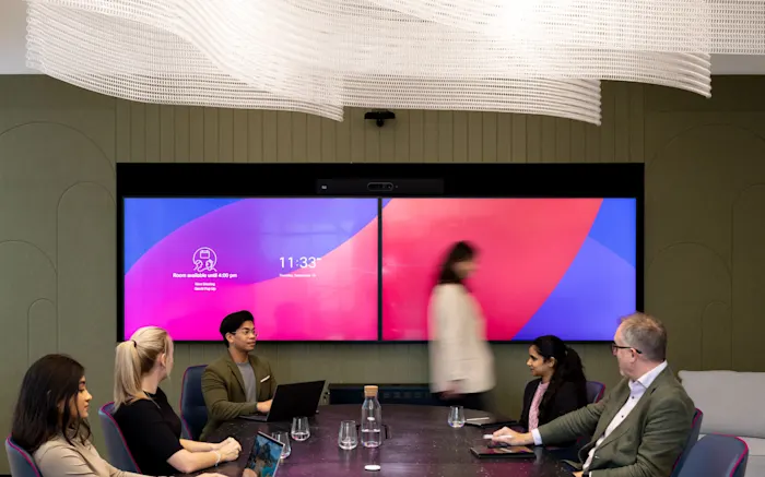 Furniture reuse was important: all existing workstations were retained, meeting tables adapted and resized to suit, and all meeting chairs were reupholstered.